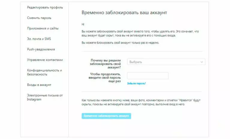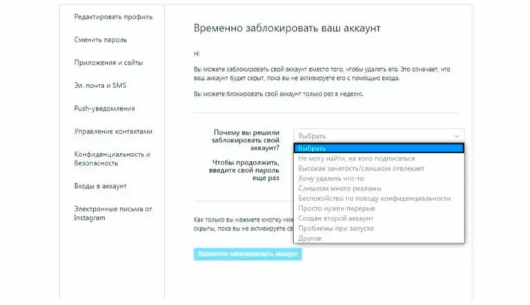 Временное удаление Instagram